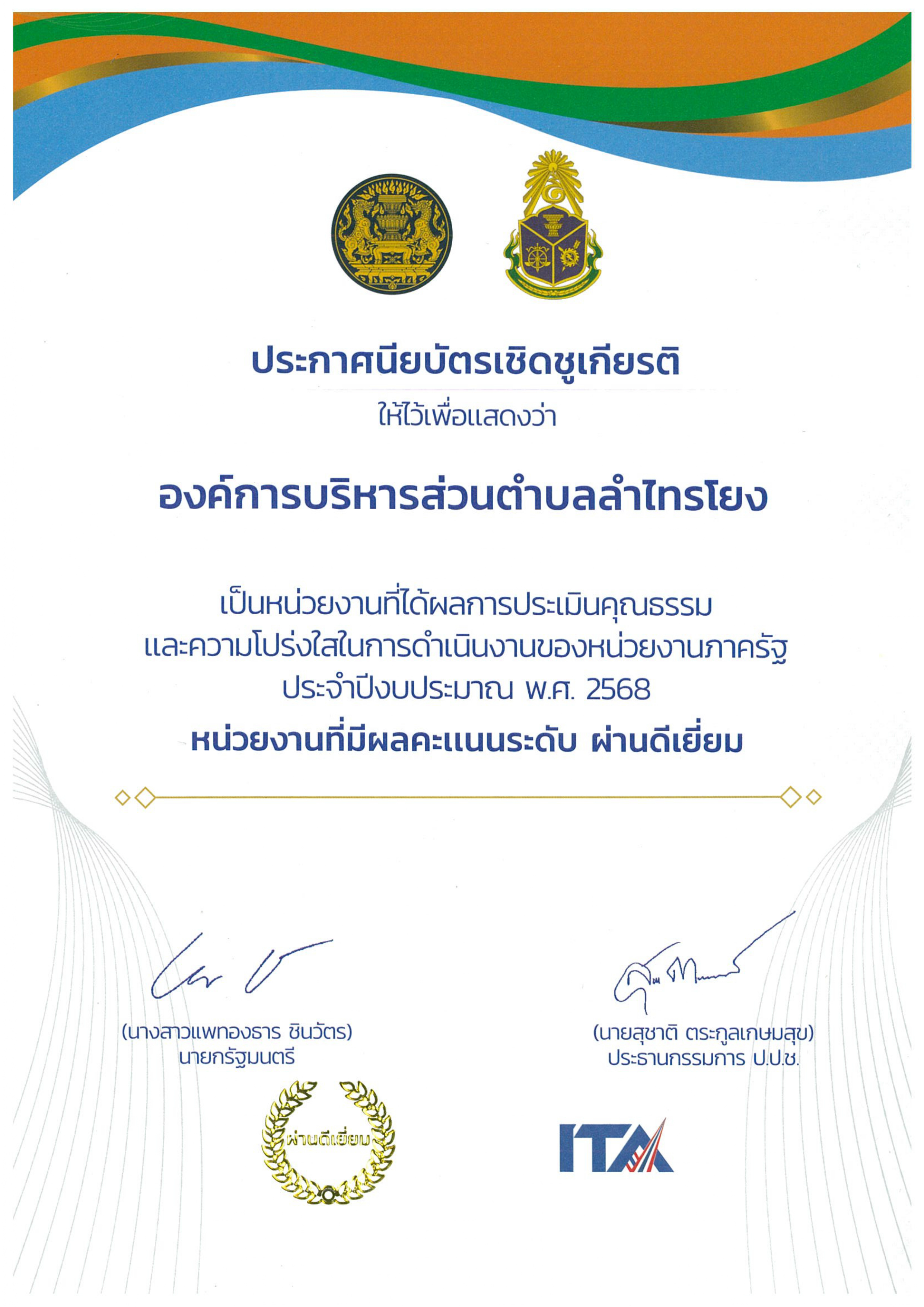 นายลมัย ธรรมสูตร นายกองค์การบริหารส่วนตำบลลำไทรโยง พร้อมคณะผู้บริหาร สมาชิกสภาฯ ปลัด รองปลัด หัวหน้าส่วนราชการ และพนักงานเจ้าหน้าที่องค์การบริหารส่วนตำบลลำไทรโยง ขอขอบคุณทุกท่านที่ร่วมกันขับเคลื่อนคุณธรรมและความโปร่งใสในการดำเนินงานของหน่วยงานภาครัฐ (Integrity and Transparence Assessment-ITA) ประจำปีงบประมาณ พ.ศ. 2568